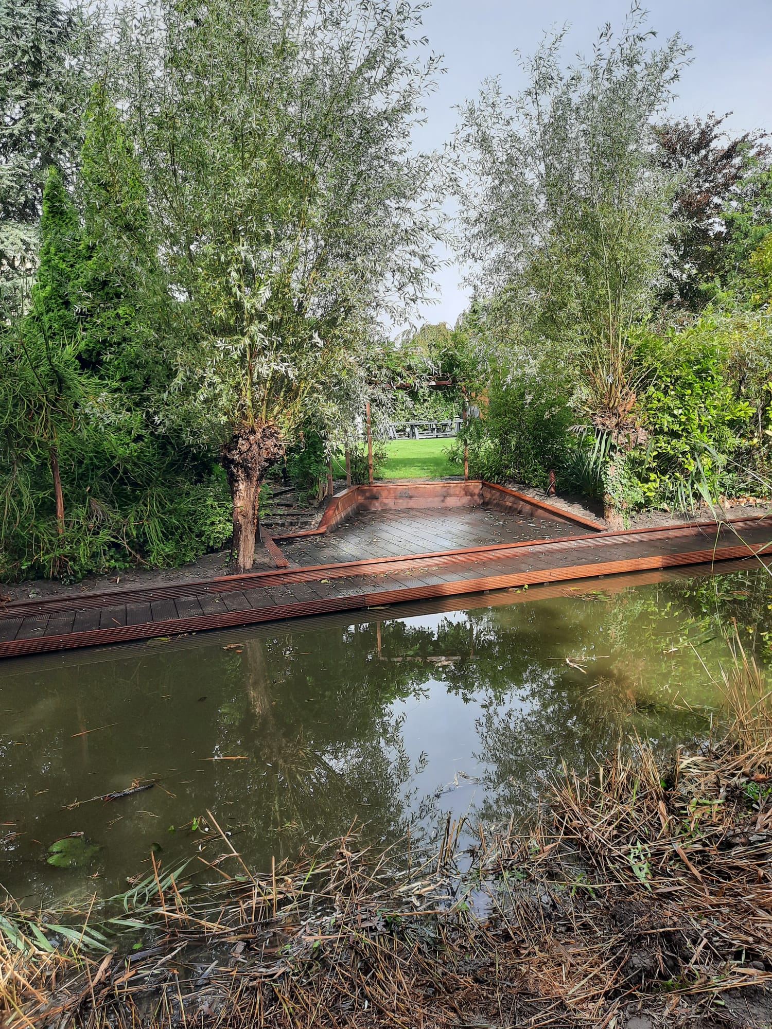 Voor dit project hebben wij een 35 meter lange hardhouten beschoeiing geplaatst, afgewerkt met duurzame DuoWood kunststof vlonderplanken.